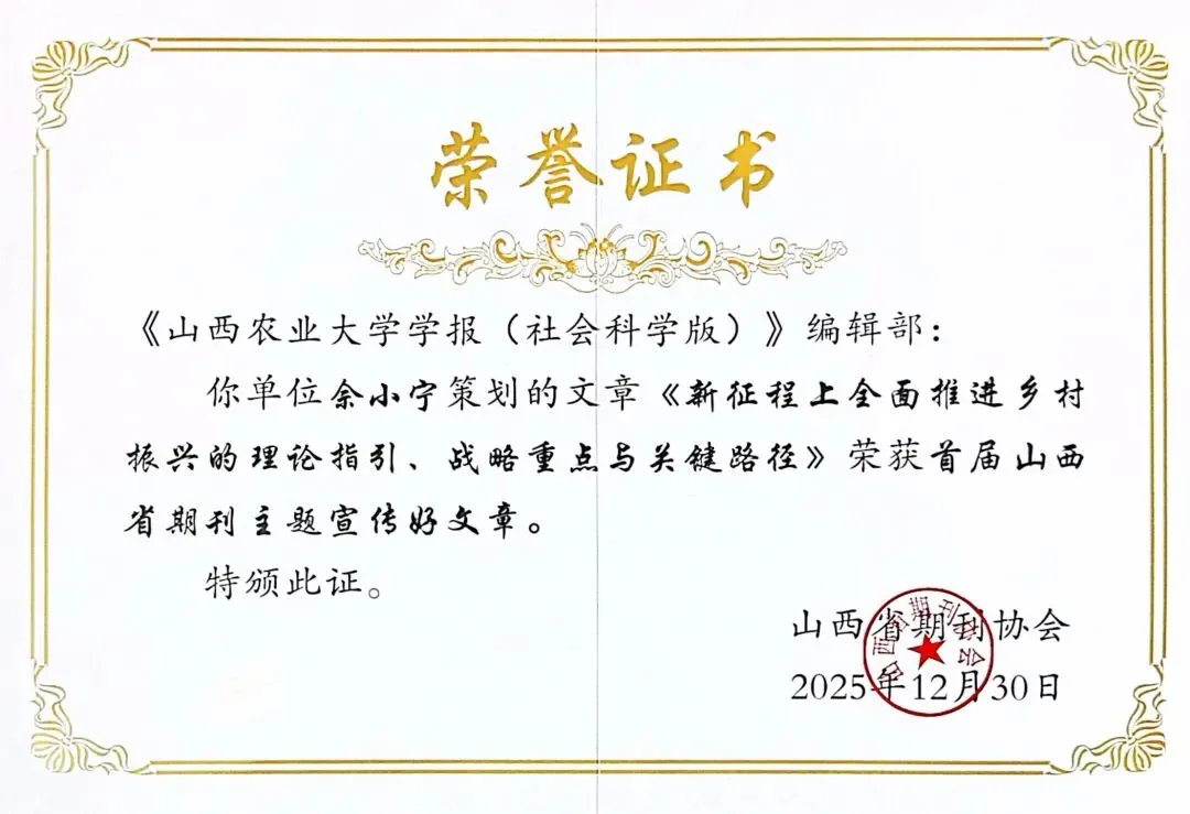 与此同时,《学报》刊载的时任农业农村部(国家乡村振兴局)中国扶贫发展中心主任,黄承伟研究员撰写的《新征程上全面推进乡村振兴的理论指引、战略重点与关键路径》一文,在众多参评作品中脱颖而出,荣获“山西省期刊主题宣传‘好文章’”称号。文章立足新时代乡村振兴战略实施背景,深入剖析了乡村振兴的理论根基、战略重点与实践路径,论证严谨、见解深刻,为全国乡村振兴事业的深入推进提供了宝贵的学术参考。