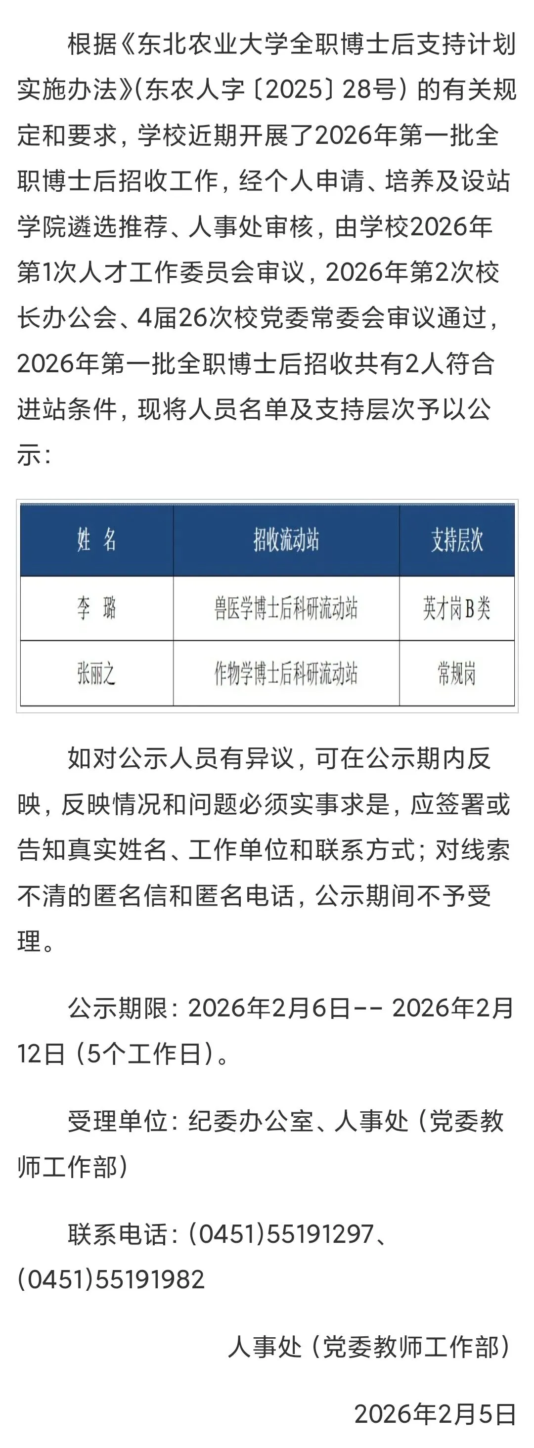 >东北农业大学2026年第一批全职博士后招收情况公示