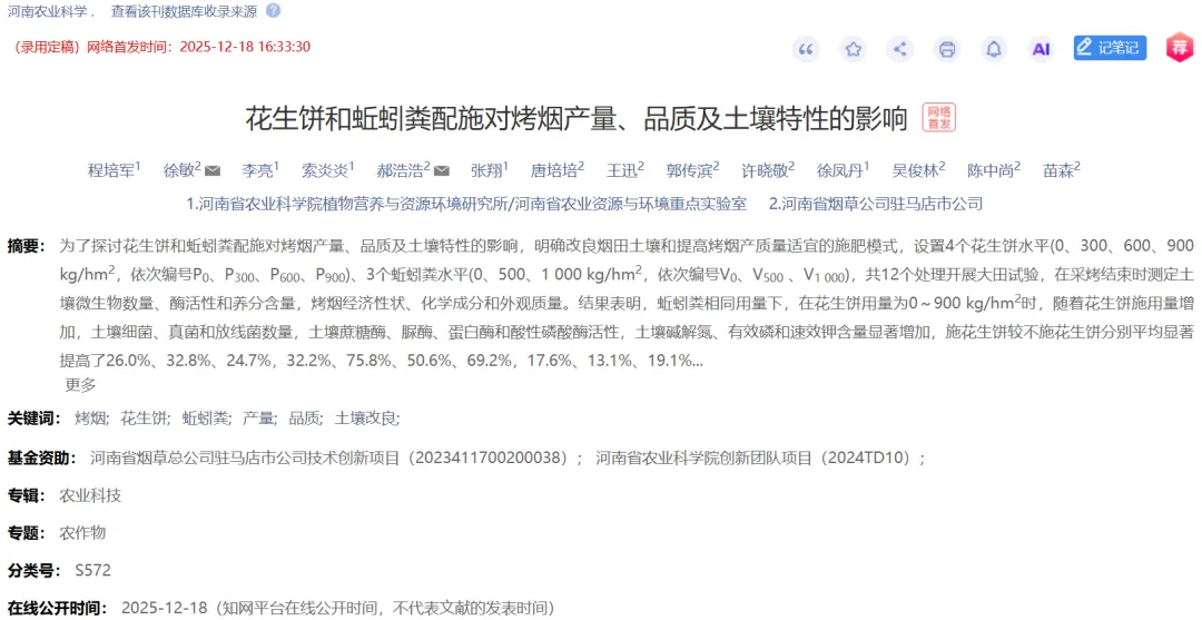 作者:程培军,徐敏,李亮,索炎炎,郝浩浩,张翔,唐培培,王迅,郭传滨,许晓敬,徐凤丹,吴俊林,陈中尚,苗森相关单位:1.河南省农业科学院植物营养与资源环境研究所/河南省农业资源与环境重点实验室;2.河南省烟草公司驻马店市公司摘要:为了探讨花生饼和蚯蚓粪配施对烤烟产量、品质及土壤特性的影响,明确改良烟田土壤和提高烤烟产质量适宜的施肥模式,设置4个花生饼水平(0、300、600、900kg/hm2,依次编号P0、P300、P600、P900)、3个蚯蚓粪水平(0、500、1000kg/hm2,依次编号V0、V500、V1000),共12个处理开展大田试验,在采烤结束时测定土壤微生物数量、酶活性和养分含量,烤烟经济性状、化学成分和外观质量。结果表明,蚯蚓粪相同用量下,在花生饼用量为0~900kg/hm2时,随着花生饼施用量增加,土壤细菌、真菌和放线菌数量,土壤蔗糖酶、脲酶、蛋白酶和酸性磷酸酶活性,土壤碱解氮、有效磷和速效钾含量显著增加,施花生饼较不施花生饼分别平均显著提高了26.0%、32.8%、24.7%,32.2%、75.8%、50.6%、69.2%,17.6%、13.1%、19.1%。花生饼相同用量下,随蚯蚓粪施用量增加,土壤细菌、真菌和放线菌数量,土壤蔗糖酶、脲酶、蛋白酶和酸性磷酸酶活性,土壤碱解氮、有效磷和速效钾含量亦呈现增加趋势,施蚯蚓粪较不施蚯蚓粪分别平均显著提高了14.9%、10.3%、16.9%,7.1%、14.1%、36.0%,39.5%,7.6%、6.4%、6.2%。施花生饼和蚯蚓粪均能改善烤烟化学成分和外观质量,提高烤烟产量,但施用效果受蚯蚓粪施用量的影响。在不施蚯蚓粪(V0)条件下,施花生饼较不施花生饼烤烟平均增产15.8%;在施蚯蚓粪(V500、V1000)条件下,施花生饼较不施花生饼烤烟平均增产为22.2%。综上,施花生饼和蚯蚓粪均能提高土壤微生物数量、酶活性和养分含量,改善烤烟化学成分和外观质量,提高烤烟产量,以蚯蚓粪(1000kg/hm2)+花生饼(600kg/hm2)配施效果最佳。