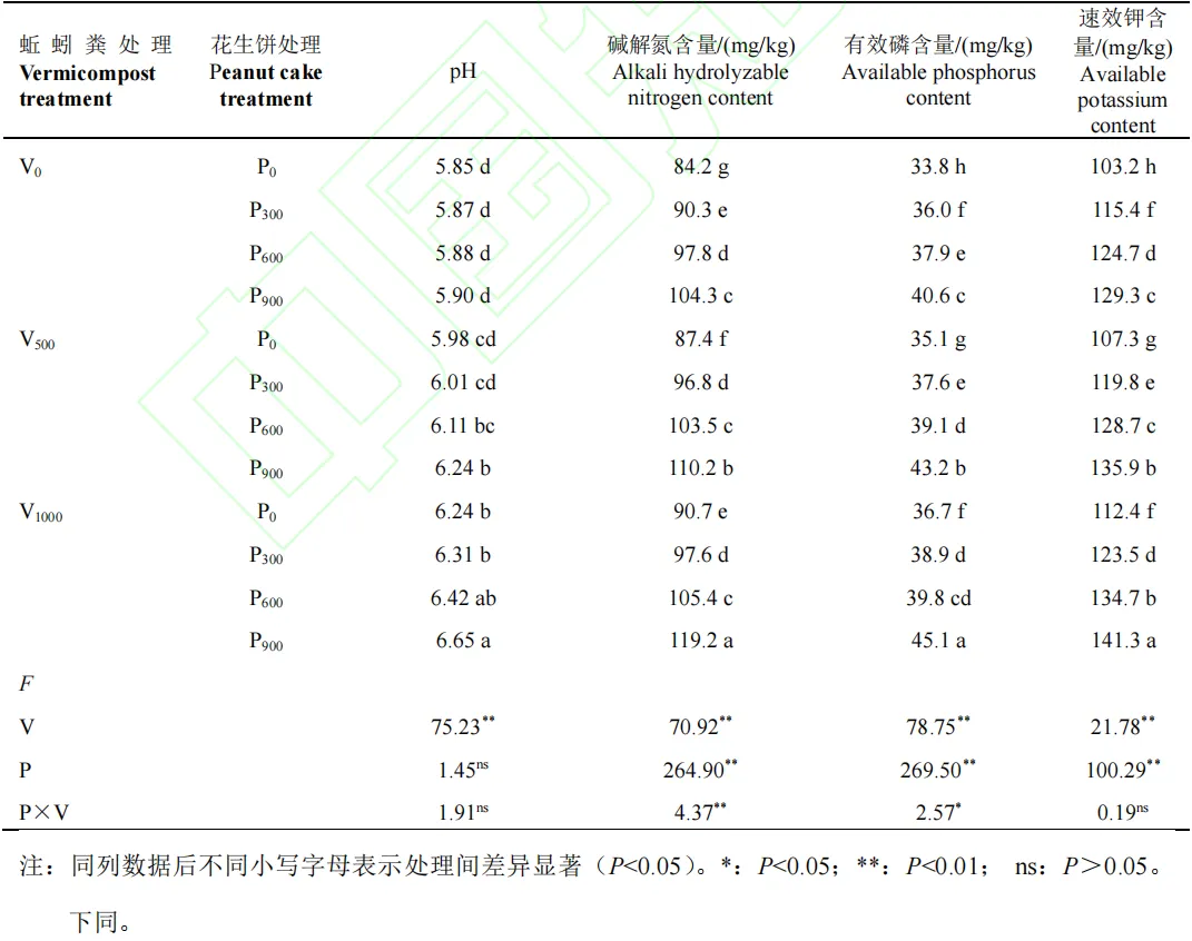 花生饼和蚯蚓粪配施处理对土壤养分的影响