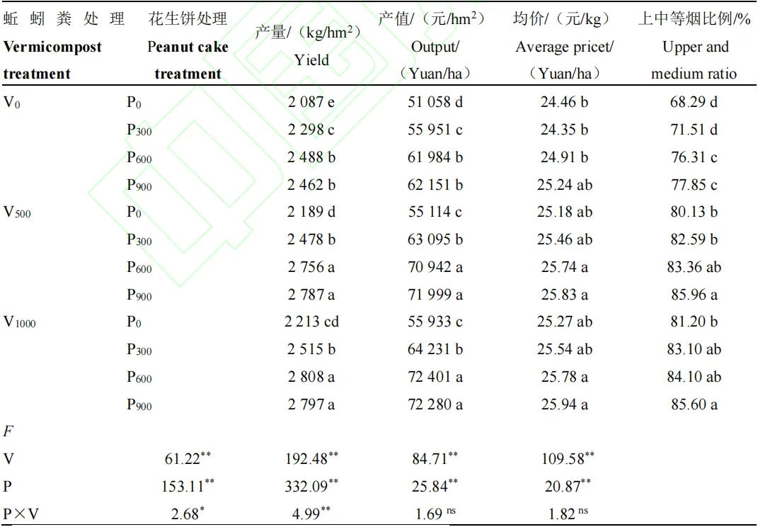 施蚯蚓粪和花生饼对烤烟产量、产值、均价和上中等烟比例影响极显著(P<0.01)。施花生饼处理烤烟产量和产值的F值均高于施蚯蚓粪处理,施蚯蚓粪处理烤烟均价和中上等烟比例的F值均高于施花生饼处理。表明施花生饼对烤烟产量和产值的贡献大于施蚯蚓粪,施蚯蚓粪对烤烟均价和上中等烟比例的贡献大于花生饼。