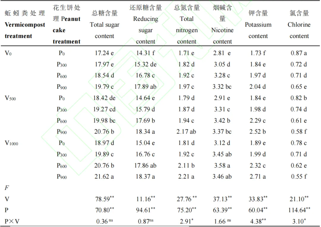 不同花生饼和蚯蚓粪配施处理对烤烟化学成分的影响