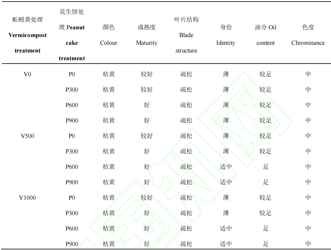 不同花生饼和蚯蚓粪配施处理对烤烟外观质量的影响