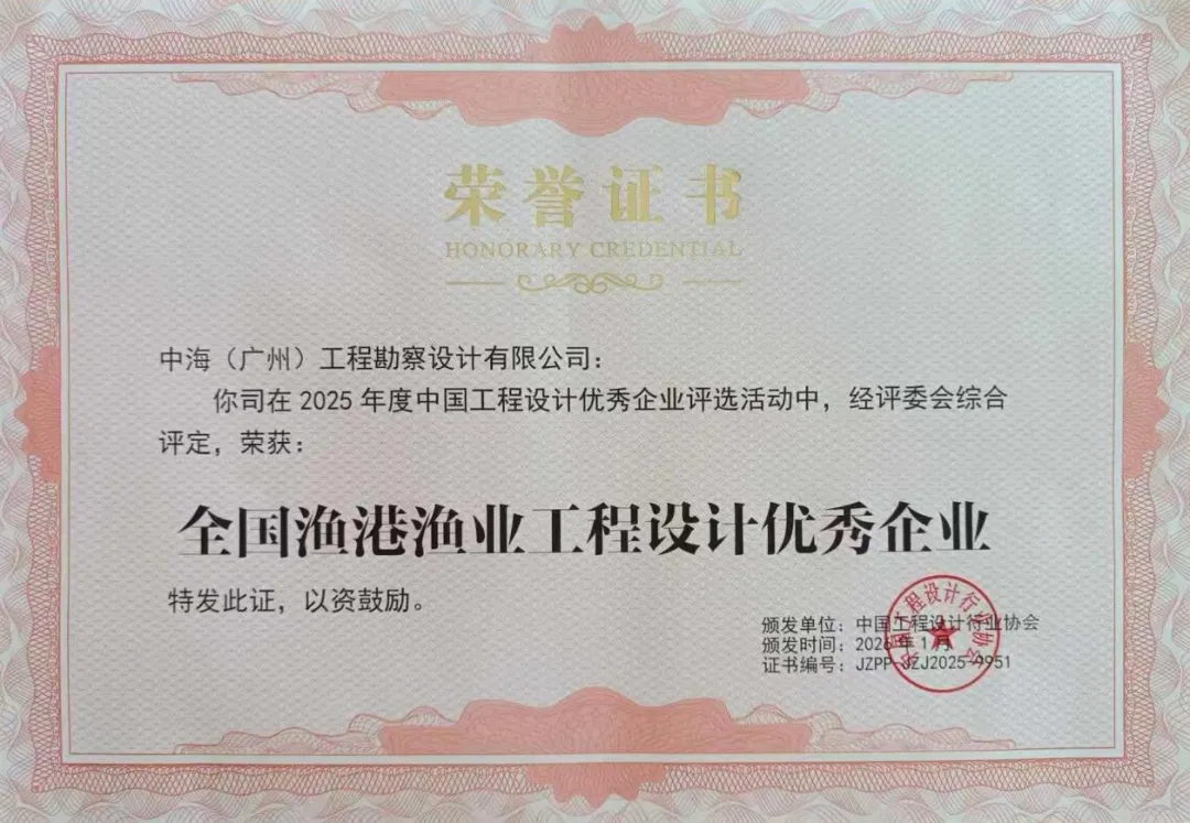 近日,中海总局所属中海设计院获评为“全国渔港渔业工程设计优秀企业”。该荣誉由行业主管部门组织评审颁发,旨在表彰渔港渔业工程设计领域具备突出专业技术能力、卓越项目管理水平与显著行业贡献的单位,是对企业专业实力与实践成果的高度认可。