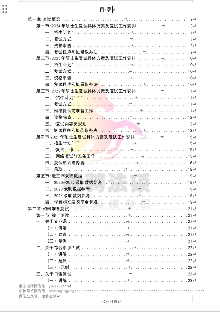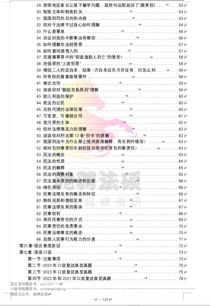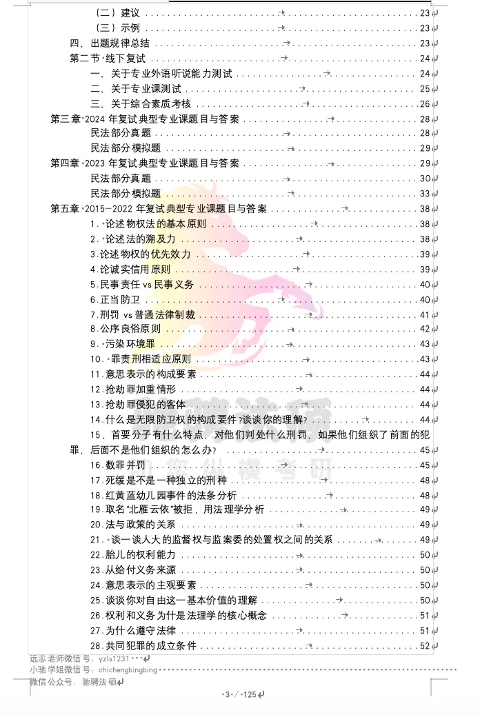 若需要东北林业大学近年来全部真题及参考答案,可以使用东北林业大学法硕复试指南资料,基本上每年备考考生每人人手一本。内容具体包含东北林业大学法硕复试概况,线上、线下复试流程,近年来专业课复试真题及参考答案,复试笔试真题,英语面试真题及模板等资料(资料目录截图如下)