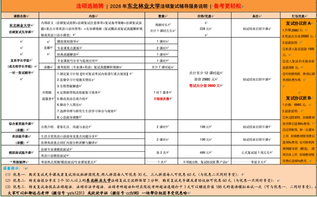 若在备考的过程中还需要直更加全面系统的复试辅导,可以选择复试协议班,包含复试先导课(含复试指南资料)、直系学长学姐1V1辅导,综合素质提升课、英语口语提升、个性化包装简历、导师邮件、英语自我介绍修改等,以下是东北林业大学复试课程介绍。