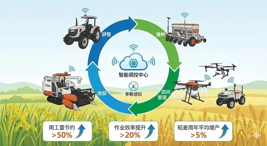 该技术聚焦高效自动驾驶、参数感知、智能调控等核心,集成创制全程智能化作业装备。应用后,可实现除插秧环节外的稻麦智能化无人作业,用工量节约超50%,作业效率提升20%以上,稻麦周年平均增产超5%。