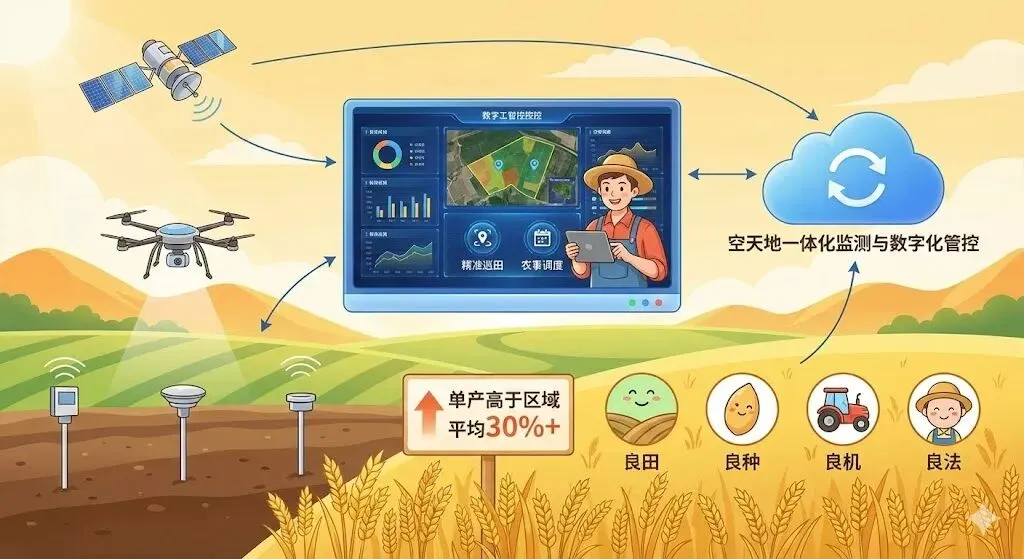 该技术以空天地一体化监测为核心,实现种植全流程数字化管控。通过精准巡田与农事调度,可帮助规模种植地区实现单产高于区域平均30%以上,推动良田、良种、良机、良法融合。