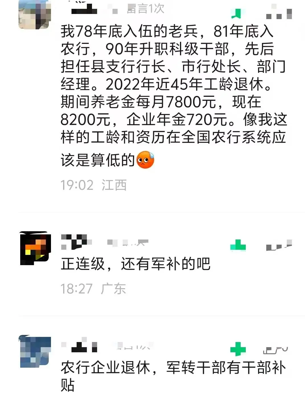 面帅看到有坐标为江西的读者,在评论区分享自己的退休养老金情况。我78年底入伍的老兵,81年底入农行,90年升职科级干部,先后担任县支行行长、市行处长、部门经理。2022年近45年工龄退休。期间养老金每月7800元,现在8200元,企业年金720元。像我这样的工龄和资历在全国农行系统应该是算低的。他的工龄(含军龄视同缴费年限)近45年,算是面帅这段时间看到比较长的工龄期了。最近这几年银行不少退休人员,工龄都有超过43年以上。根据这位读者的披露,他先后担任县支行行长、市行处长、部门经理,现在每个月退休养老金8200元,企业年金720元,共计8920元。因为他转业到银行单位的,并没有说明在部队是什么级别的,如果达到一定的级别还有额外的干部补助。他认为“像我这样的工龄和资历在全国农行系统应该是算低的”,因为他的坐标在江西,养老金差异可能更多体现的地区的“月计发基数”。因为月计发基数,经常是参考退休所在地的社会平均工资确定的。根据江西省人社部门发布的通知,江西省2025年度城镇职工基本养老保险基本养老金计发基数为7054元/月。