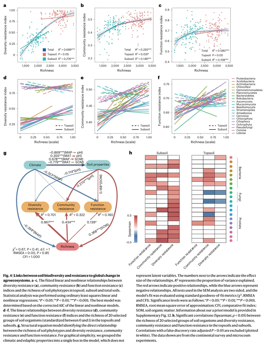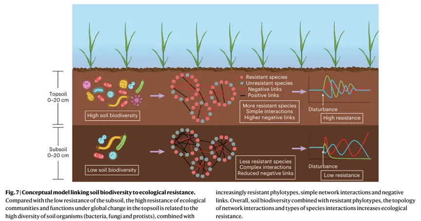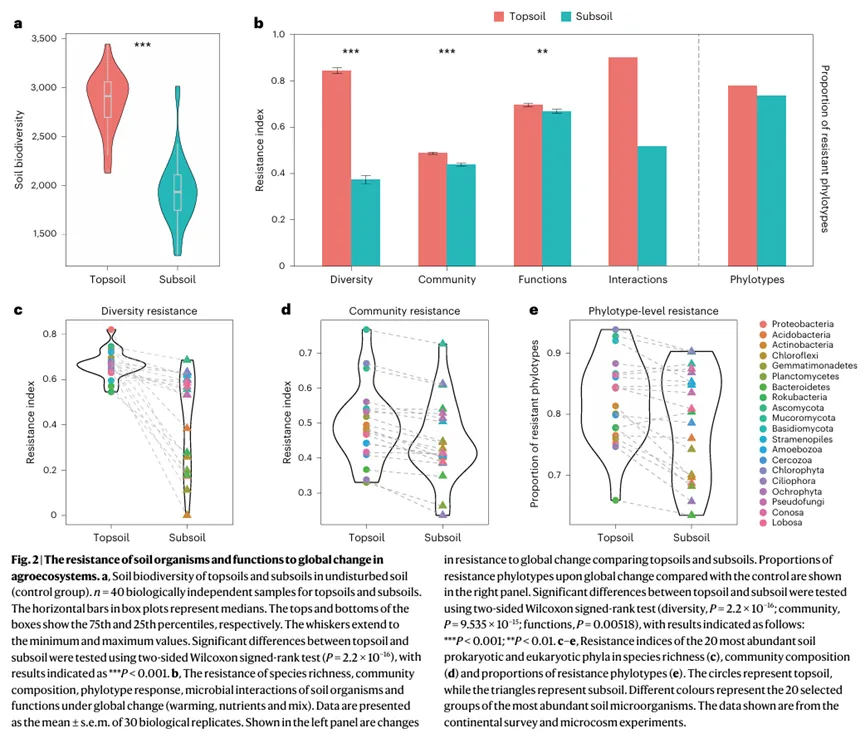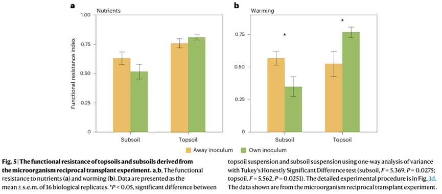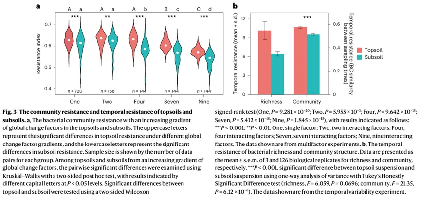 研究结合了田间试验、微宇宙试验和微生物互换试验,分析了表层土壤(0-20 cm)和亚表层土壤(20-40 cm)在升温、养分富集及其组合干扰下的生态抗性。研究包括以下内容: