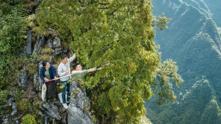 崖柏科研团队在悬崖峭壁上采集崖柏种子
