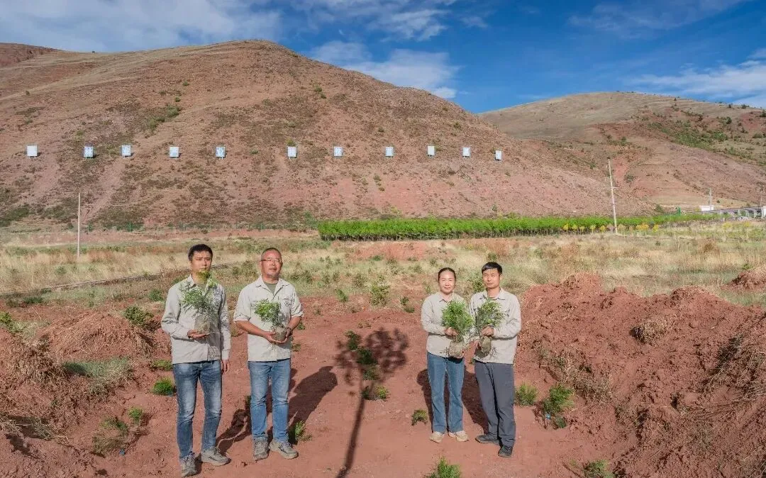 杨泉(左二)和同事们带着精心培育的崖柏幼苗奔赴西藏