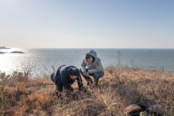 杨泉(右)查看栽种在山东长岛国家海洋公园的崖柏生长状况