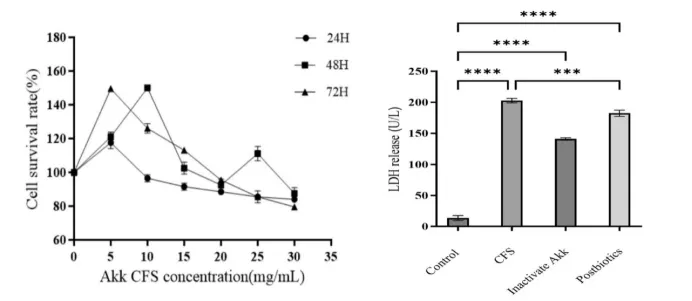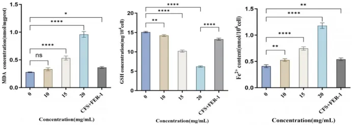 (1)嗜黏蛋白阿克曼菌(Akk 菌)的代谢物是抑制结直肠癌细胞(Caco-2)增殖的关键活性成分,其作用机制主要通过激活铁死亡通路实现—具体表现为诱导细胞内活性氧(ROS)、丙二醛(MDA)及亚铁离子(Fe²⁺)含量升高,同时降低谷胱甘肽(GSH)水平,且铁死亡抑制剂(Fer-1)可逆转该效应。此外,Akk菌代谢物对正常肠道上皮细胞(ncm460)毒性极低,安全性良好,转录组分析进一步提示其可能协同调控 PI3K-AKT、Hippo 等关联信号通路。