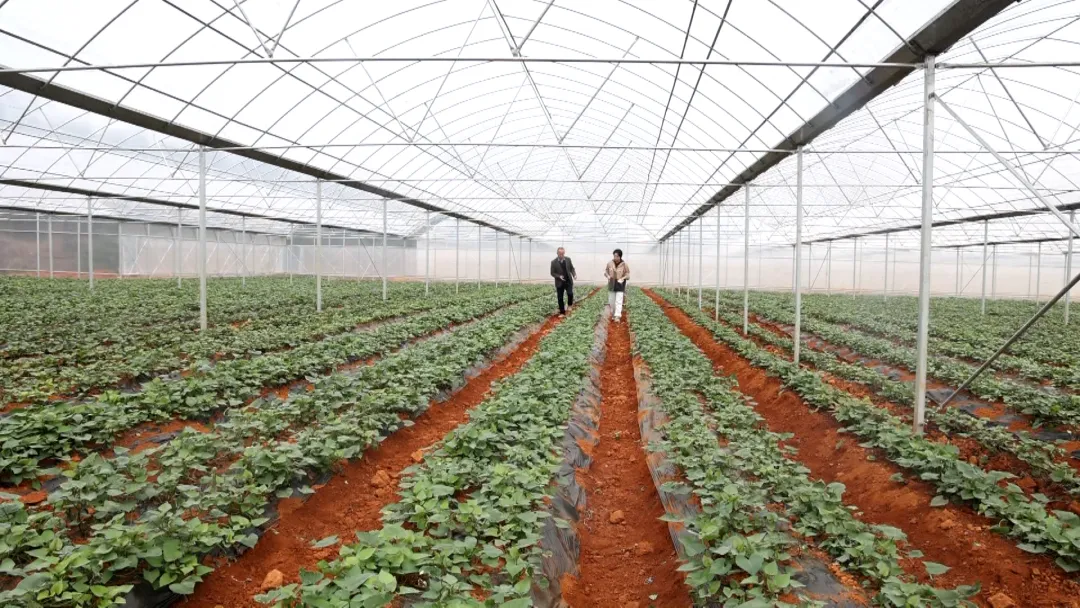 贵港市中农信投现代农业有限公司经理 叶先举:目前我们已建成一期200亩的大棚并投入使用,我们率先种植的80亩鲜食红薯和80亩的西红柿,试种效果十分理想。下一步将重点推进圣女果、贝贝南瓜等蔬菜的种植,形成多元化种植格局。