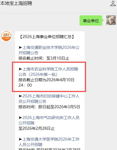 温馨提示:进入【本地宝上海招聘】公众号,对话框回复关键词【事业单位】可快速获取完整公告、报名方式。