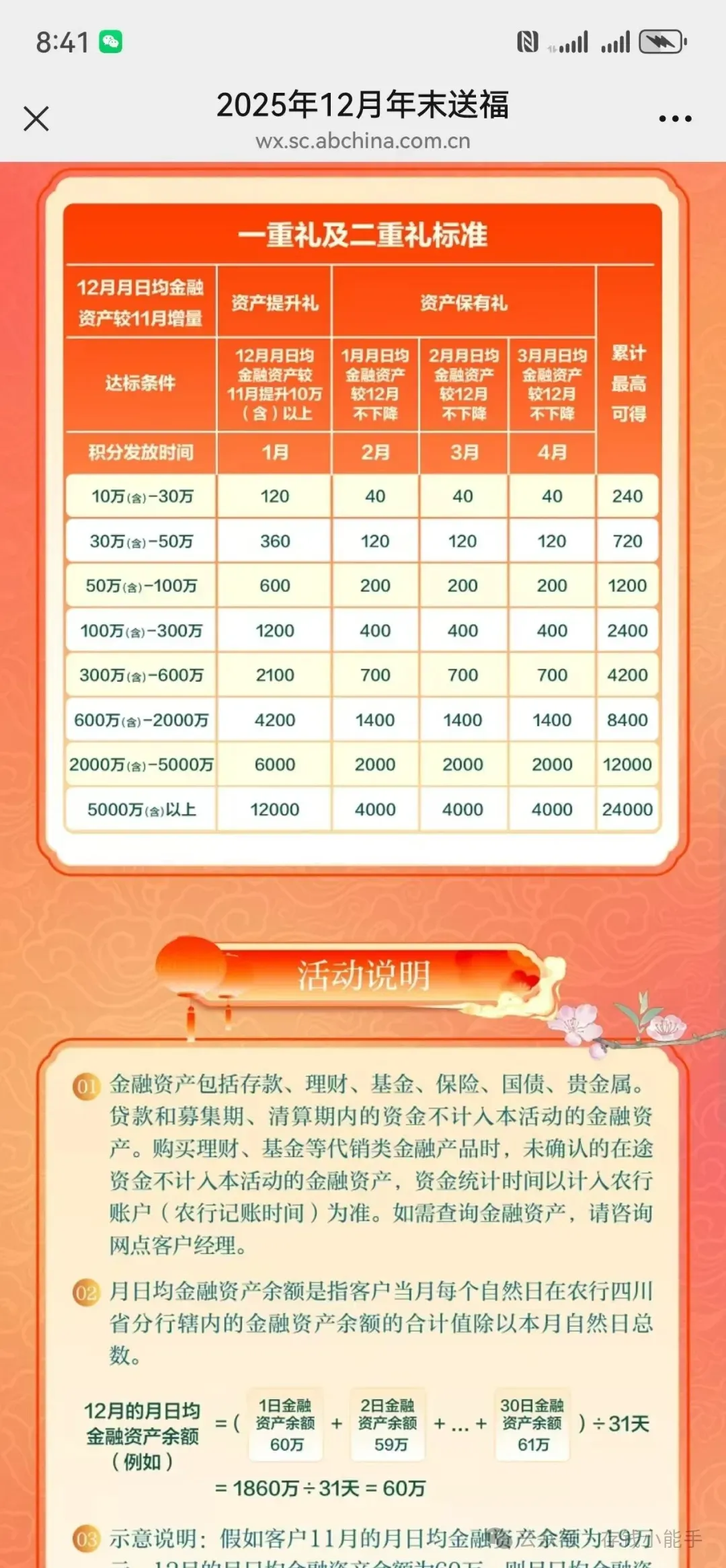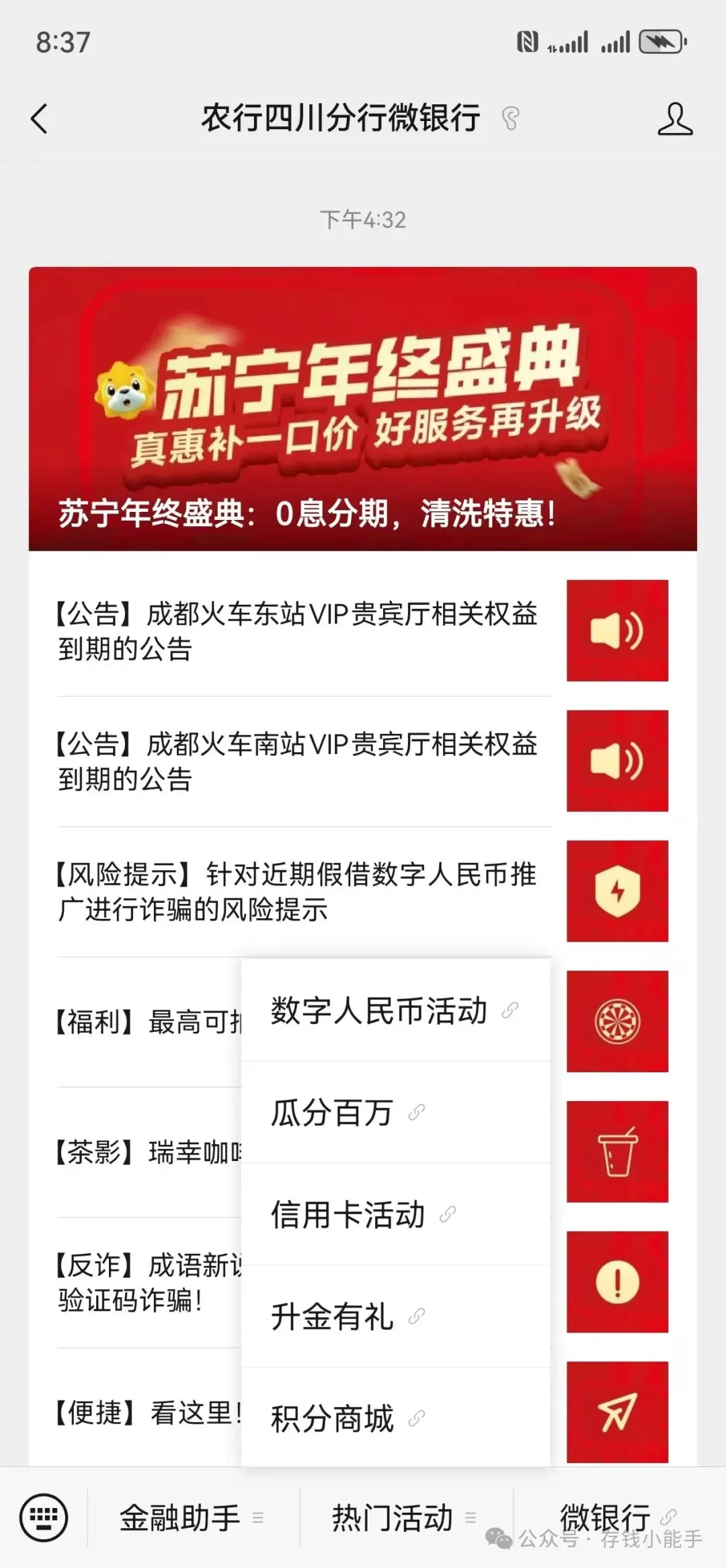 农业银行的增资活动,全国可以参加,在线开个四川分行的二类户即可。早早就在各种群里听说四川分行有活动,但不知道怎样参加。问了很多群主,也说不知道。其实啊,这种活动是农业银行官方的活动,并不会因为参加人数多少有所改变。打了客服,客服也不知道。农行四川分行微银行公众号,服务号,升金有礼进行报名。配合增资活动,12月的活期,几乎能够达到年化利率2.5,如果您资金量大,又想要存活期,可以加我微信。还有以下银行可以新开,利率高高,都在中国人民银行官网的存款保险银行名单内,本金和利息受存款保险保护众邦12月搞了个大活动,新户无论存什么期限,加息0.3,