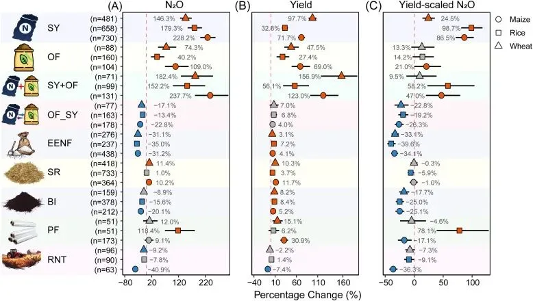 文章标题:A global meta-analysis of N2O emission-yield trade-offs in wheat, rice and maize systems under different agricultural management
