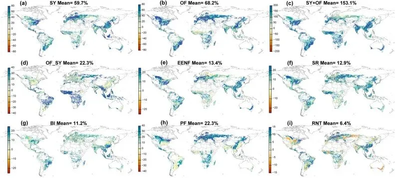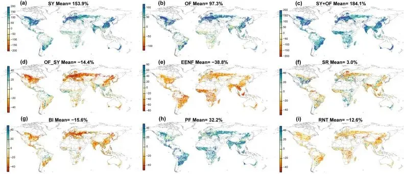 Fig. 4. Spatial projections of the effects of various management practices on N2O emissions. Model performance evaluation and variable importance ranking are provided in Supplementary Fig.s S13, 14, 15.