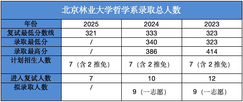 虽然没有找到北京林业大学2025年的拟录取名单,但是根据复试名单(进入复试同学的初试总分分别为:338、331、324、349、341、326、333)以及计划招生人数(7人)可推测,今年最后录取的同学初试总分普遍都不会太高,主要集中在330-340之间。