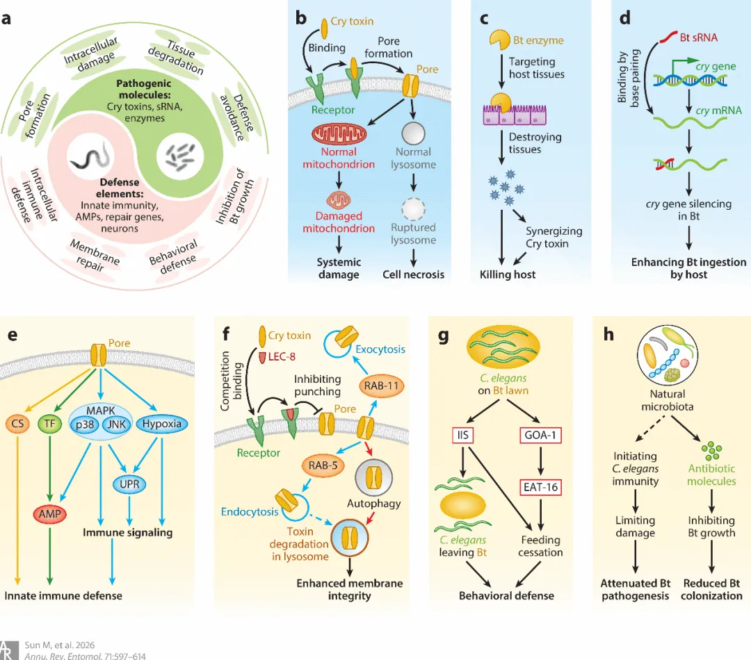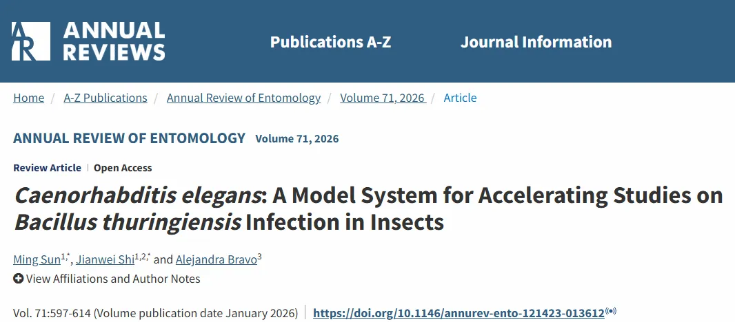 2026年1月29日,华中农业大学农业微生物资源发掘与利用全国重点实验室微生物农药创新团队负责人孙明教授受邀在昆虫学领域国际学术期刊Annual Review of Entomology(IF5Y=20.7)发表了题为“Caenorhabditis elegans: A Model System for Accelerating Studies on Bacillus thuringiensis Infection in Insects”的综述文章,提出了“加速苏云金芽胞杆菌侵染昆虫和线虫的生物学研究模型系统”的学术观点和建议。