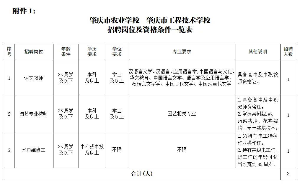 本次招聘共3个岗位,共3人。岗位具体要求见《招聘岗位及资格条件一览表》(如下图所示)。