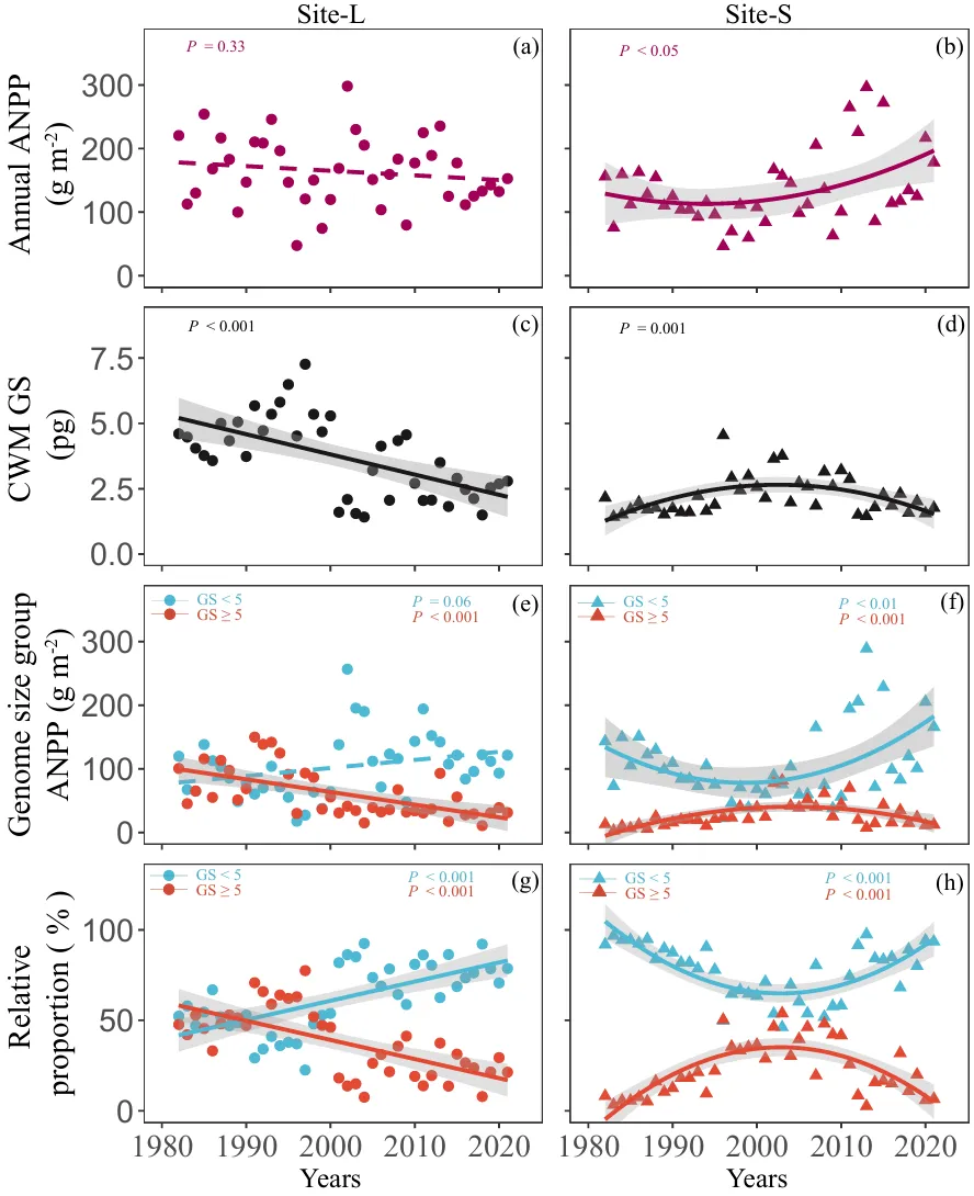 研究发现,过去40年间,随着区域气温持续升高,草地群落中大基因组植物与小基因组植物在生长策略和生产力贡献上呈现出显著分化:气候变暖显著提前了大基因组植物的物候进程,但同时抑制了其生长速率和生物量积累;相比之下,小基因组植物虽物候启动较晚,却在变暖条件下表现出更高的生长速率和更强的生产力响应。上述差异最终导致大基因组植物对群落生产力的贡献持续下降,而小基因组植物在群落中的相对优势不断增强,从而驱动草地群落结构沿时间尺度发生系统性转变。进一步的机制分析表明,基因组大小通过限制细胞分裂速率对温度变化的响应,进而约束植物个体生长速率。在高温条件下,大基因组植物的细胞分裂速率对温度的敏感性显著降低,而小基因组植物能够维持较高且稳定的细胞分裂与生长能力。这一细胞层面的生理约束,解释了群落尺度上植物生产力和组成随气候变暖发生重组的内在原因。