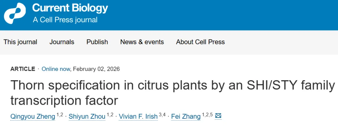 2026年2月2日,华中农业大学园艺林学学院、果蔬园艺作物种质创新与利用全国重点实验室张飞教授课题组研究成果以“Thorn specification in citrus plants by an SHI/STY family transcription factor”为题在Current Biology发表。研究首次鉴定到一个决定枝刺身份的SHI/STY家族转录因子TI3,阐明了TI3–TI1/TI2–CsWUS分子通路如何精确终止枝刺分生组织的干细胞活性,并揭示了相邻腋芽中CsCEN–CsFD蛋白复合物通过抑制TI3来维持腋芽发育潜能的机制。该研究不仅揭示了植物分生组织命运抉择的新理论框架,也为通过基因编辑培育无刺柑橘新种质提供了重要的基因资源。