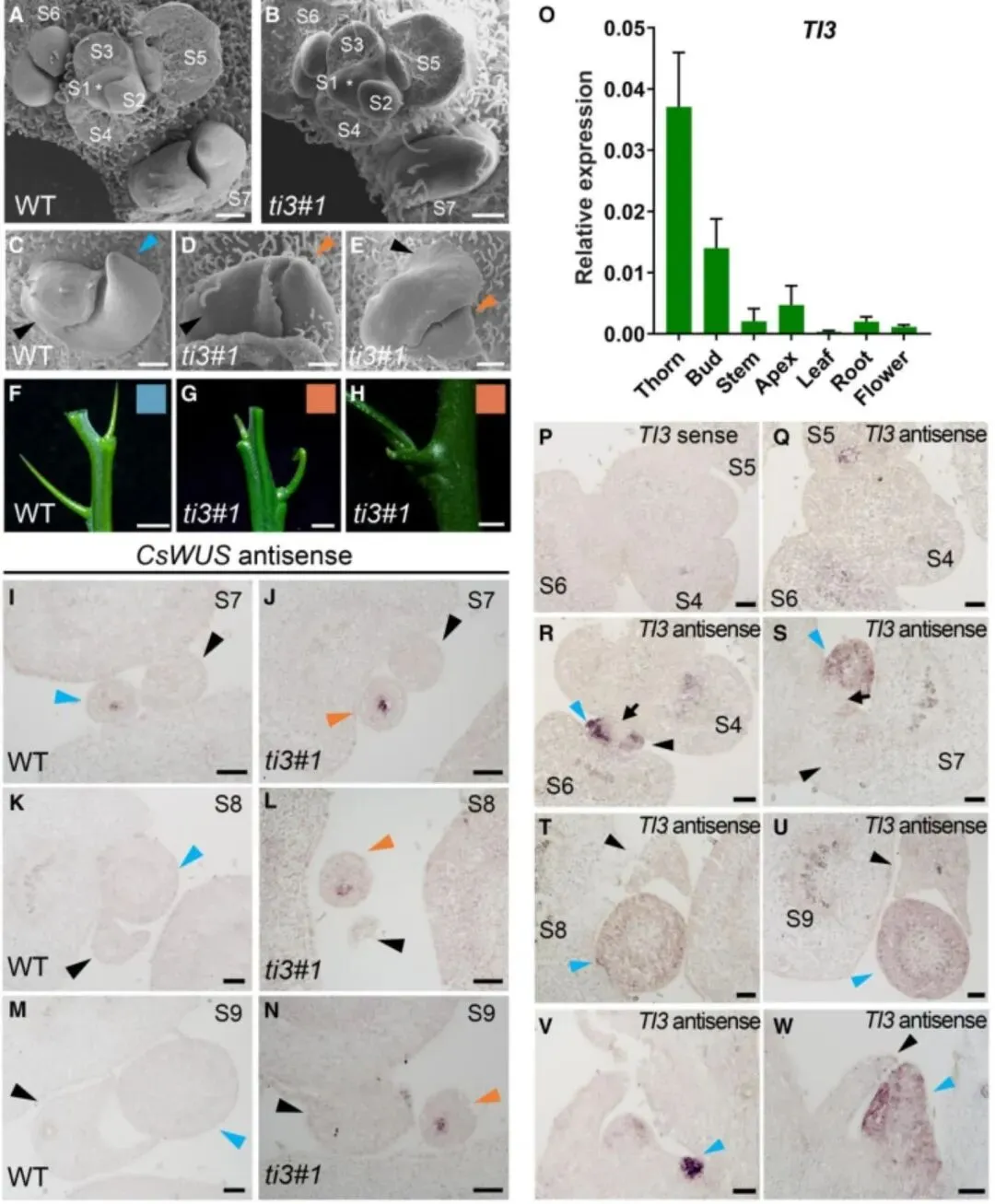 图1 TI3在刺分生组织和刺原基表达,终止刺分生组织干细胞活性