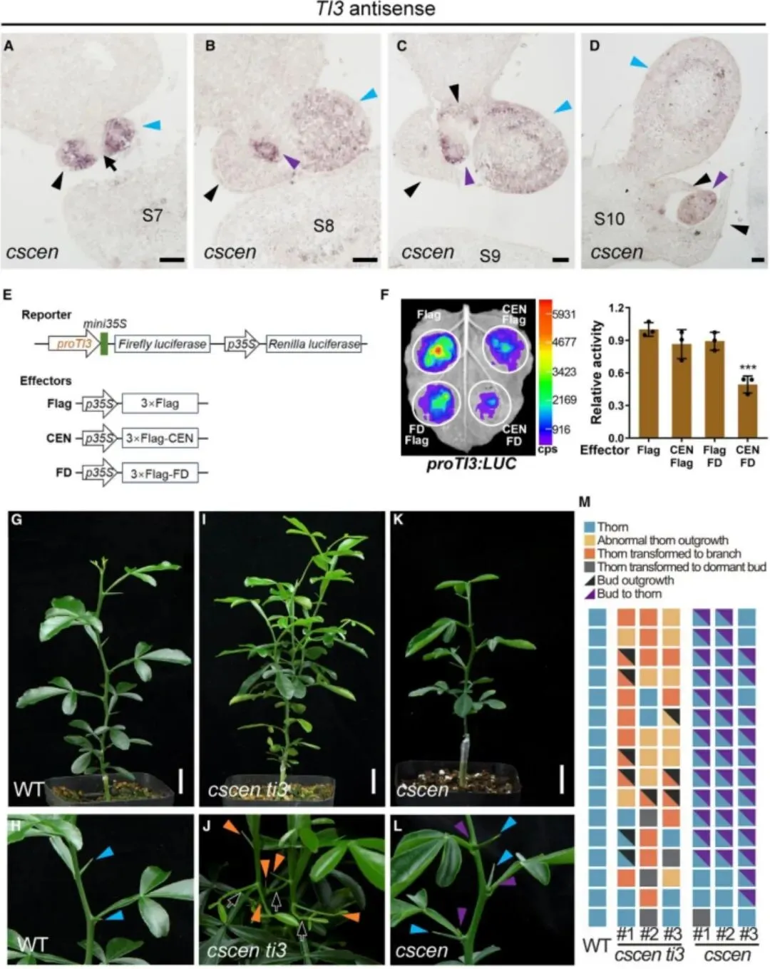 前期研究发现,CsCEN 功能缺失突变体的每个叶腋处,休眠腋芽均异位发育为刺,表现为“双刺”表型。本研究通过RNA原位杂交证实,这些异位发育的刺中出现了 TI3 基因的异常表达(图2)。进一步的机制研究表明,CsCEN 蛋白与 CsFD 形成复合体,直接抑制 TI3 基因的启动子转录活性。关键的遗传证据显示,cscen ti3 双突变体的表型与 ti3 单突变体相同,均为“双分枝”,而非 cscen 单突变体的“双刺”,证明 CsCEN 在腋芽发育中位于 TI3 上游。这些结果表明,CsCEN 作为 TI3 的关键上游抑制因子,在空间上限制刺发育程序的错误启动,从而维持腋芽的发育潜能。