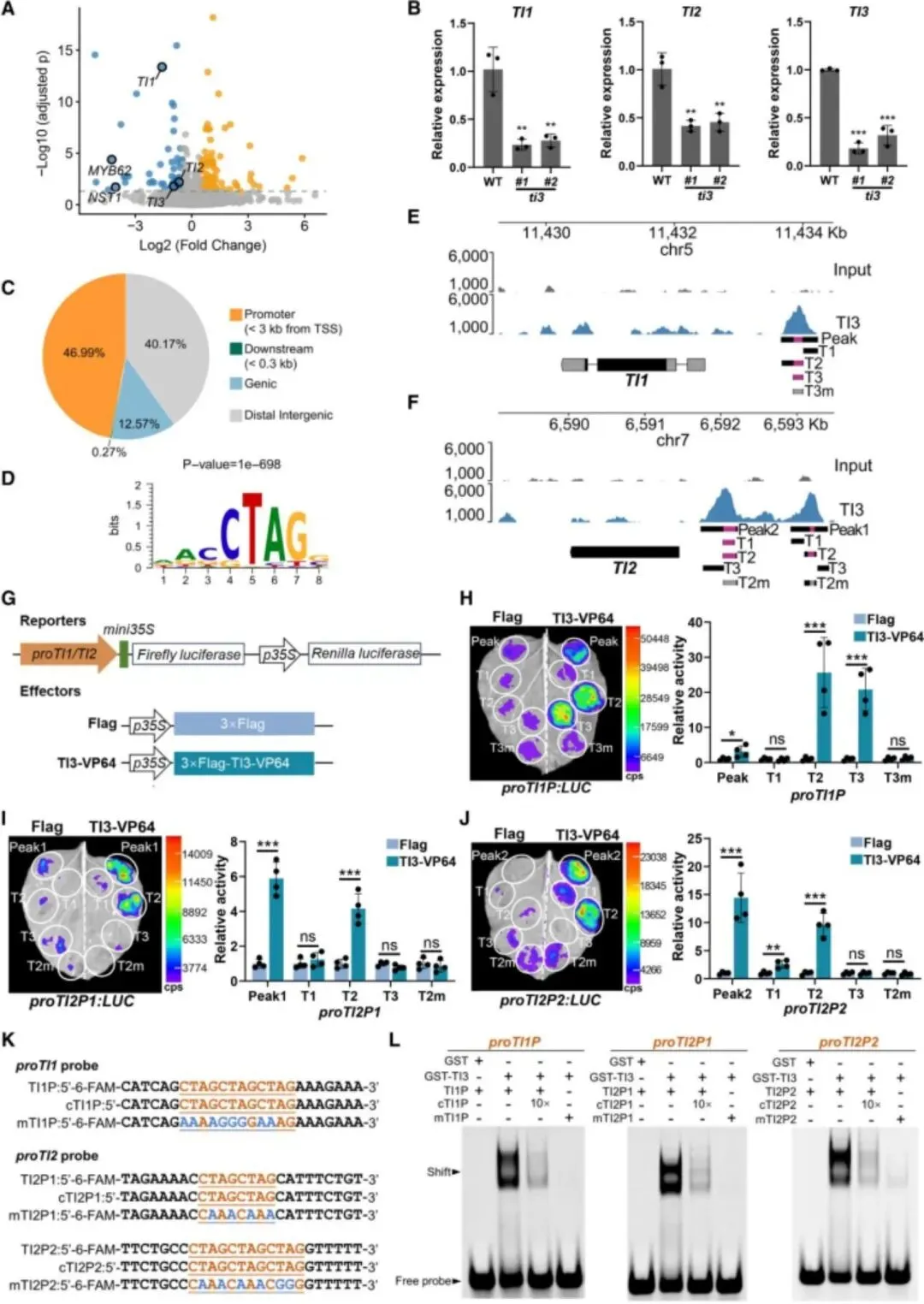 图3 TI3 结合CTAG顺式作用元件直接促进枝刺身份基因表达