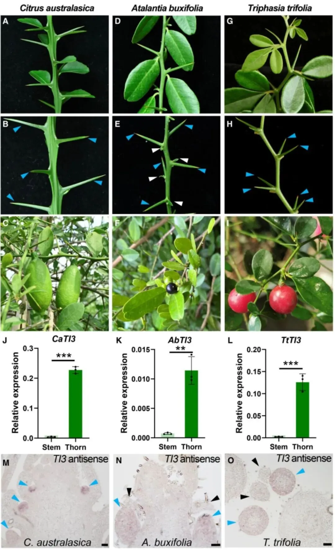 研究还揭示了枝刺发育核心调控机制的进化保守性。在芸香科的代表物种如澳指檬、酒饼簕和香吉果中,TI3 的同源基因均表现出在枝刺中特异性高表达的模式,表明这一调控模块在芸香科植物中具有广泛的保守性(图4)。