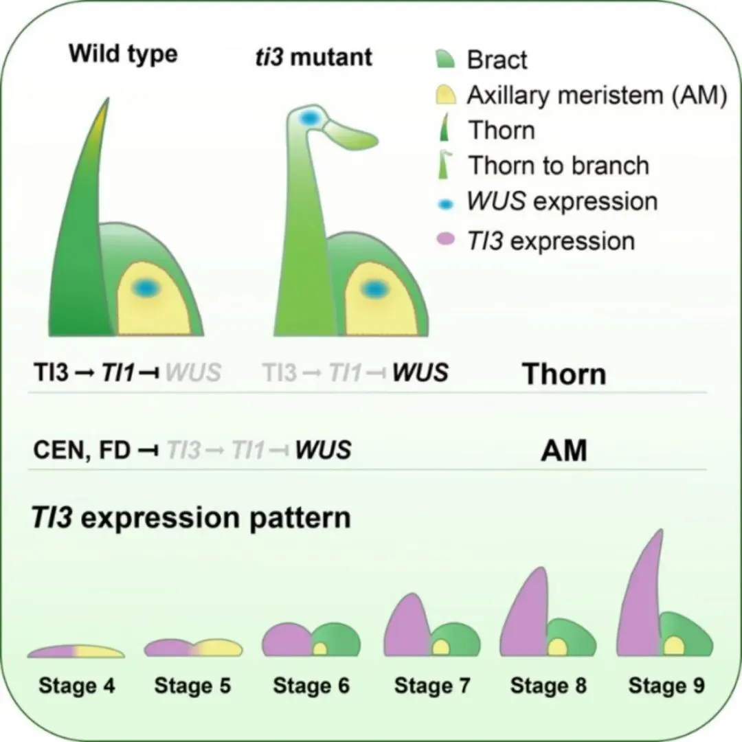 研究通过嫩刺-嫩茎杆的比较转录组分析和CRISPR-Cas9基因编辑筛选,鉴定出一个SHI/STY家族转录因子 TI3。在枳橙中敲除 TI3 基因后,突变体叶腋处的枝刺完全转变为可继续生长的侧枝或休眠芽,证实 TI3 是枝刺发育的必需基因(图1)。进一步表达模式分析显示,TI3 特异性地在刺分生组织和早期刺原基中积累,而在相邻的腋芽分生组织中不表达。