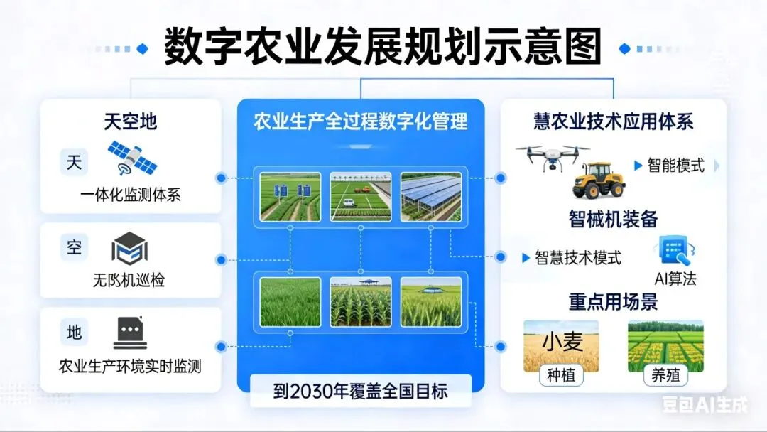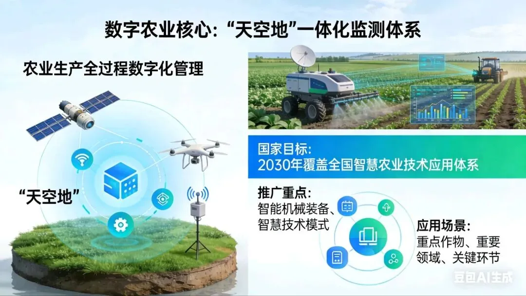 数字农业的核心是推动“天空地”一体化监测体系建设,实现农业生产全过程数字化管理。国家层面提出,到2030年建成覆盖全国的智慧农业技术应用体系,智能机械装备、智慧技术模式大范围推广,重点作物、重要领域、关键环节建成智慧应用场景。