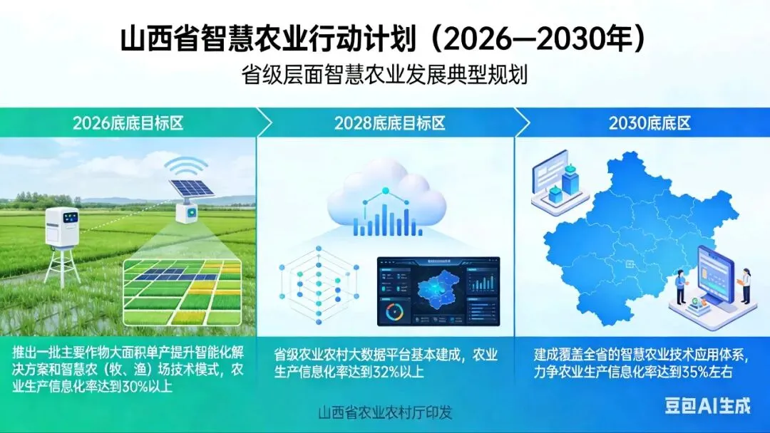 山西省印发的《智慧农业行动计划(2026—2030年)》是省级层面的典型代表。该计划提出分阶段目标:到2026年底,推出一批主要作物大面积单产提升智能化解决方案和智慧农(牧、渔)场技术模式,农业生产信息化率达到30%以上;到2028年底,省级农业农村大数据平台基本建成,农业生产信息化率达到32%以上;到2030年底,建成覆盖全省的智慧农业技术应用体系,力争农业生产信息化率达到35%左右。
