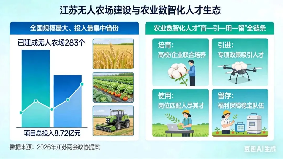 江苏已建成283个无人农场,项目总投入8.72亿元,在粮食、蔬菜、棉花等作物上实现大面积无人化作业,是全国无人农场建设规模最大、投入最集中的省份之一。2026年江苏两会期间,省政协委员提出要围绕智慧农业、无人农场、农业电商等场景,构建农业数智化人才“育—引—用—留”全链条生态。
