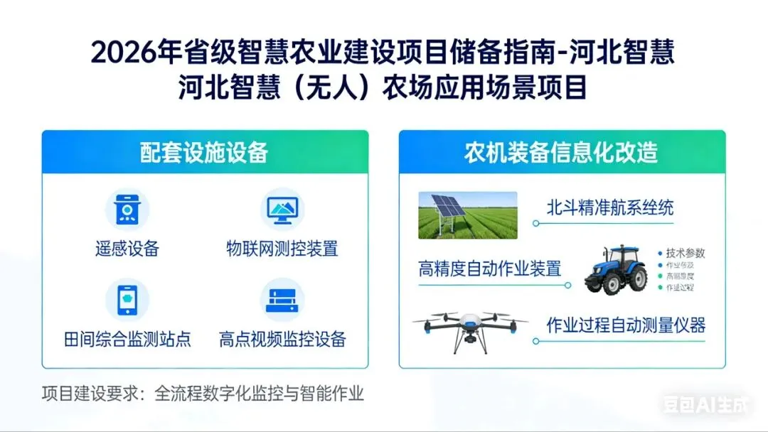 河北在《2026年省级智慧农业建设项目储备指南》中专门设立“智慧(无人)农场应用场景项目”,要求配套遥感、物联网测控、田间综合监测站点、高点视频监控等设施设备,对农机装备进行信息化改造,实现以北斗为主的精准导航、高精度自动作业和作业过程自动测量。