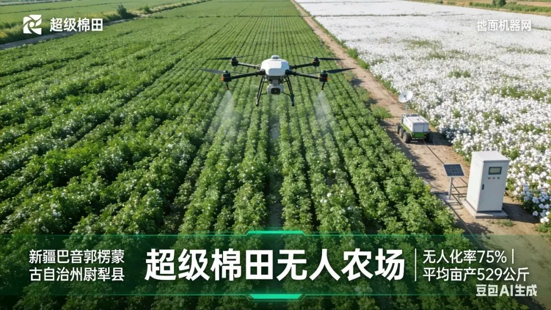 新疆巴音郭楞蒙古自治州尉犁县的“超级棉田”无人农场,占地3000亩,采用空中机器人、地面机器人、农业物联网和智慧农场管理系统,无人化率达到75%,平均棉花亩产达到529公斤,成为全国棉花无人农场的典型样板。