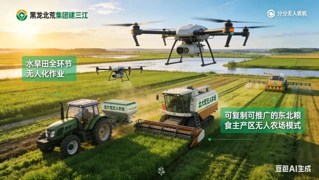 黑龙江北大荒集团建三江分公司无人农场规模庞大、设备先进,实现了水旱田各环节的大面积无人化作业,为东北地区粮食主产区发展无人农场提供了可复制、可推广的模式。