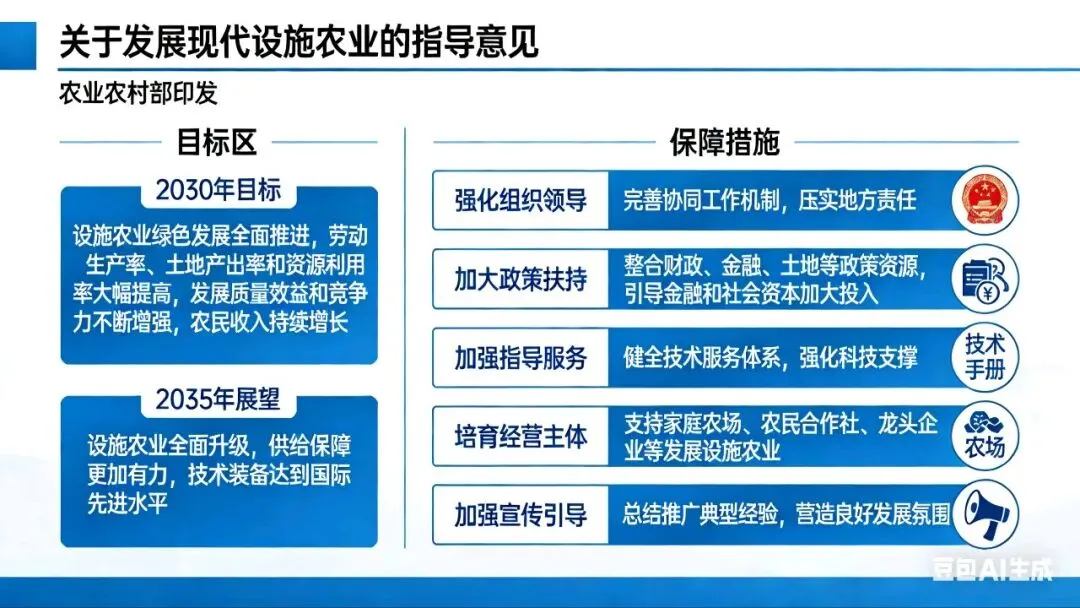 - 培育经营主体:支持家庭农场、农民合作社、龙头企业等发展设施农业