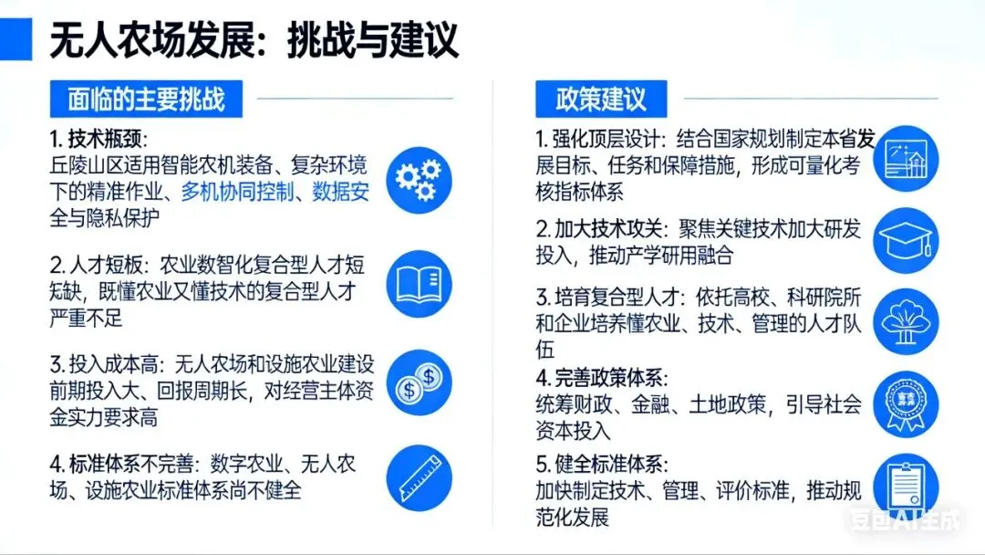 1. 技术瓶颈:丘陵山区适用智能农机装备、复杂环境下的精准作业、多机协同控制、数据安全与隐私保护等仍是制约无人农场大规模推广的关键技术瓶颈
