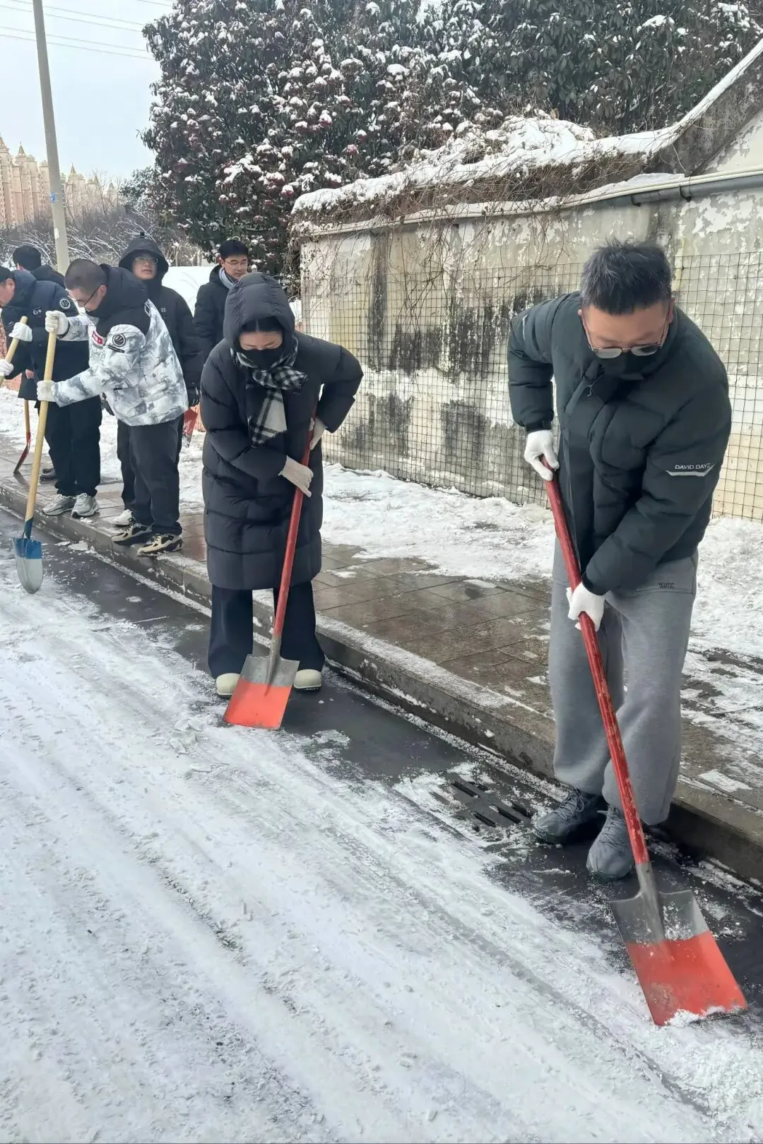 铁锹与地面的碰撞声、扫帚的沙沙声、彼此鼓励的吆喝声
