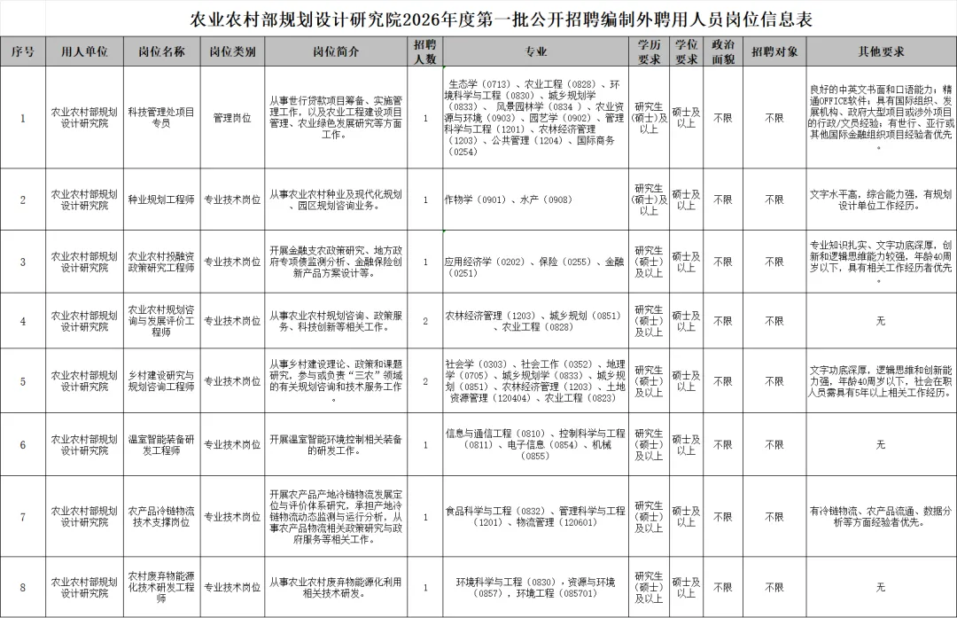 详见《农业农村部规划设计研究院2026年度第一批公开招聘编制外聘用人员岗位信息表》(附件1)。