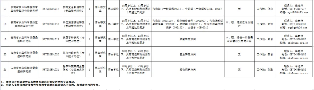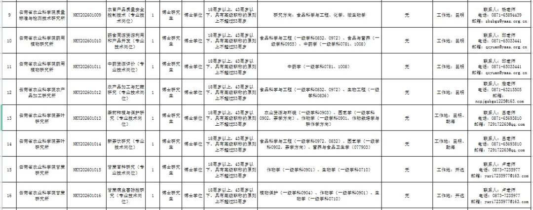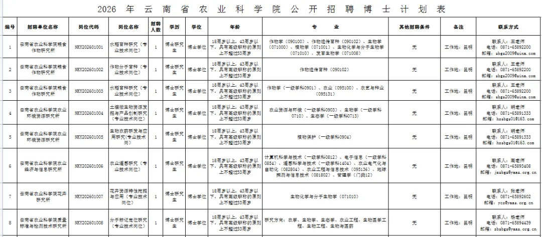 按照《事业单位公开招聘人员暂行规定》(人事部令第6号)《云南省事业单位公开招聘工作人员办法》(云人社发〔2016〕182号)等法律法规,根据工作需要,经云南省人力资源和社会保障厅核准,2026年云南省农业科学院下属事业单位面向社会公开招聘博士21名,现将有关事项公告如下: 云南省农业科学院是云南省人民政府直属的多学科、综合型、公益性农业科研机构(全额拨款公益一类事业单位),成立于1976年,历史沿革可以追溯到1912年。云南省农业科学院承担云南省全局性、关键性、战略性重大农业科技问题研究任务。院机关设有11个处室,全院下属17个研究所,分布在全省7个地州(市)。 (一)云南省农业科学院粮食作物研究所是云南省农业科学院所属公益一类全额拨款事业单位,单位驻地昆明市盘龙区,负责开展主要粮食作物遗传改良、栽培技术等基础性、公益性农业科技研究与示范工作,为粮食安全提供科技支撑。 (二)云南省农业科学院农业环境资源研究所是云南省农业科学院所属公益一类全额拨款事业单位,单位驻地昆明市盘龙区,负责开展农业植物保护、土壤肥料、农业资源与环境应用基础和应用技术等基础性、公益性农业科技研究与示范工作,为农业可持续发展提供科技支撑。 (三)云南省农业科学院农业经济与信息研究所是云南省农业科学院所属公益一类全额拨款事业单位,单位驻地昆明市盘龙区,负责开展农业发展战略与政策、农业经济、农业科技信息技术等基础性、公益性农业科技研究与应用工作,为农业和农业科技发展提供软科学支撑。 (四)云南省农业科学院花卉研究所是云南省农业科学院所属公益一类全额拨款事业单位,单位驻地昆明市盘龙区,负责开展花卉与观赏园艺植物遗传改良、栽培和保鲜加工技术等基础性、公益性农业科技研究与示范工作,为花卉产业发展提供科技支撑。 (五)云南省农业科学院质量标准与检测技术研究所是云南省农业科学院所属公益一类全额拨款事业单位,单位驻地昆明市盘龙区,负责开展农业质量标准、农产品质量安全、植物新品种保护等基础性、公益性农业科技研究与应用工作,为农业产业健康发展和质量安全监管提供科技支撑。 (六)云南省农业科学院药用植物研究所是云南省农业科学院所属公益一类全额拨款事业单位,单位驻地昆明市盘龙区,负责开展主要药用植物遗传改良、栽培和采收加工技术等基础性、公益性农业科技研究与示范工作,为云药产业发展提供科技支撑。 (七)云南省农业科学院农产品加工研究所是云南省农业科学院所属公益一类全额拨款事业单位,单位驻地昆明市五华区,负责开展农产品加工新技术、新产品、新工艺、新材料、新标准等基础性、公益性农业科技研究与示范工作,为高原特色农产品精深加工提供科技支撑。 (八)云南省农业科学院茶叶研究所是云南省农业科学院所属公益一类全额拨款事业单位,单位驻地昆明市盘龙区,科研基地位于西双版纳州勐海县,负责开展茶树遗传改良、种质创新与育种、栽培与植保、茶叶加工与质量安全、茶经济与茶文化等基础性、公益性农业科技研究与示范工作,为茶叶产业发展提供科技支撑。 (九)云南省农业科学院甘蔗研究所是云南省农业科学院所属公益一类全额拨款事业单位,单位驻地红河州开远市,负责开展甘蔗遗传改良、栽培及有害生物防控等基础性、公益性农业科技研究与示范工作,为蔗糖产业发展提供科技支撑。 (十)云南省农业科学院热带亚热带经济作物研究所是云南省农业科学院所属公益一类全额拨款事业单位,单位驻地保山市隆阳区,负责管理云南省农业科学院怒江分院,负责开展热带亚热带经济作物遗传改良、耕作与栽培、植保、加工技术等基础性、公益性农业科技研究与示范工作,为热带亚热带经济作物产业发展提供科技支撑。 (十一)云南省农业科学院热区生态农业研究所是云南省农业科学院所属公益一类全额拨款事业单位,单位驻地楚雄州元谋县,负责开展退化生态恢复,高效、复合、循环生态农业,生物质能源作物和区域特色农业产业植物(作物)遗传改良创新、栽培技术等基础性、公益性农业科技研究与示范工作,为生态农业和区域特色农业产业发展提供科技支撑。 (十二)云南省农业科学院蚕桑蜜蜂研究所是云南省农业科学院所属公益一类全额拨款事业单位,单位驻地红河州蒙自市,设弥勒办公区,负责开展蚕、桑、蜂遗传育种、饲养(栽培)和加工技术等基础性、公益性农业科技研究与示范工作,为蚕、蜂产业发展提供科技支撑。 坚持德才兼备的用人标准,按照“公开、平等、竞争、择优”的招聘原则,面向社会,公开报名,统一考试,综合评定,择优聘用。 (一)云南省农业科学院粮食作物研究所公开招聘人员3名; (二)云南省农业科学院农业环境资源研究所公开招聘人员2名; (三)云南省农业科学院农业经济与信息研究所公开招聘人员1名; (四)云南省农业科学院花卉研究所公开招聘人员1名; (五)云南省农业科学院质量标准与检测技术研究所公开招聘人员2名; (六)云南省农业科学院药用植物研究所公开招聘人员2名; (七)云南省农业科学院农产品加工研究所公开招聘人员1名; (八)云南省农业科学院茶叶研究所公开招聘人员2名; (九)云南省农业科学院甘蔗研究所公开招聘人员2名; (十)云南省农业科学院热带亚热带经济
