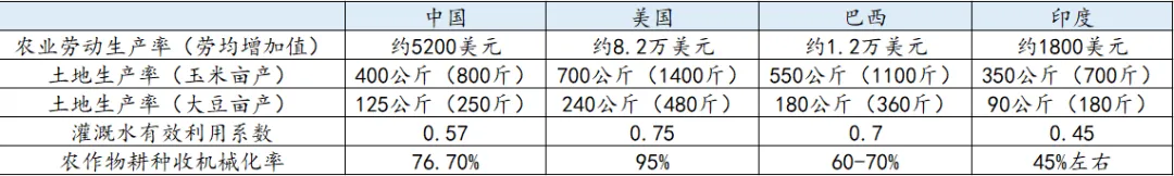 中国农业效率相比美国、巴西等有待提升,在节水和机械化方面还有待进步,但得益于多年的努力,已进步明显。国情不同,不能简单对比。