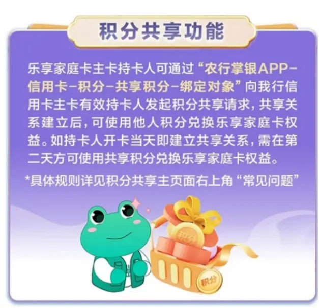 主卡持卡人可绑定另一位农行信用卡持卡人,使用对方的积分为自己兑换权益,提升积分使用灵活性。