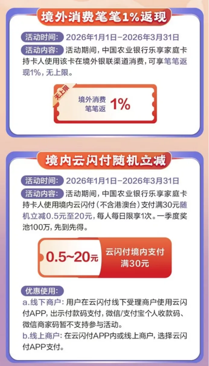 境内支付返现:使用云闪付支付满30元,每日可享随机立减0.5-20元(一季度奖池100万,先到先得)。