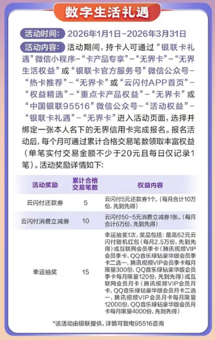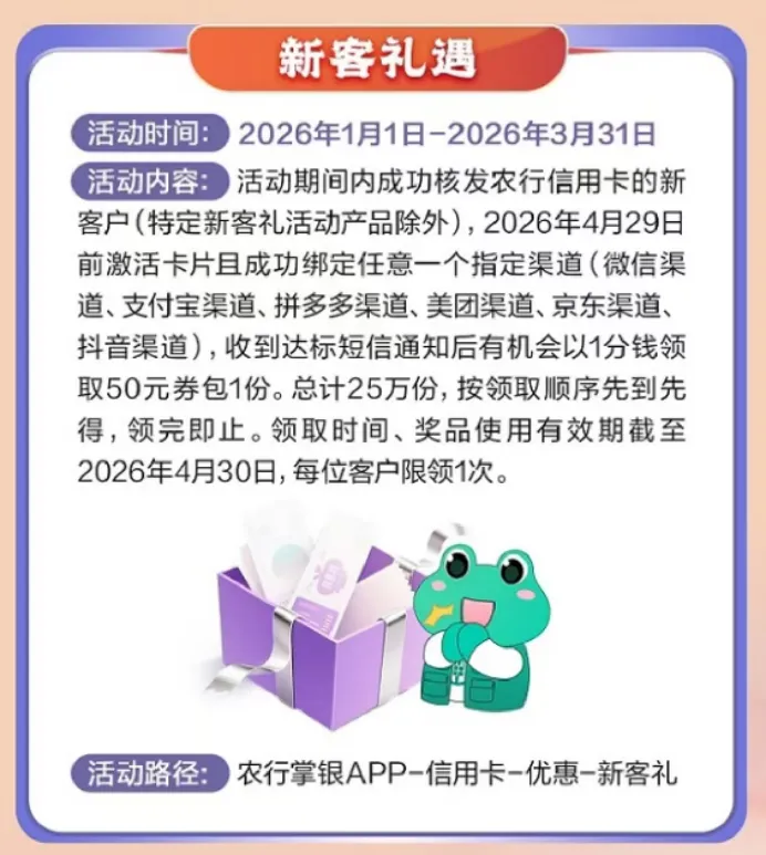 2026年一季度新办卡并激活绑定的客户,有机会以1分钱领取50元券包(总计25万份,名额有限先到先得)。