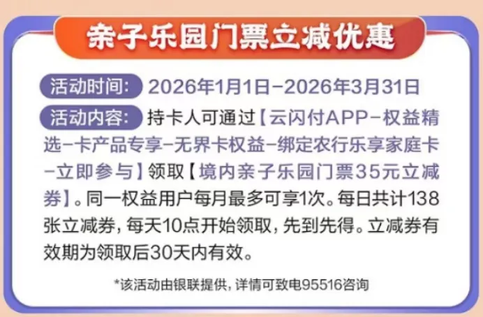 每月可领35元亲子乐园门票立减券。