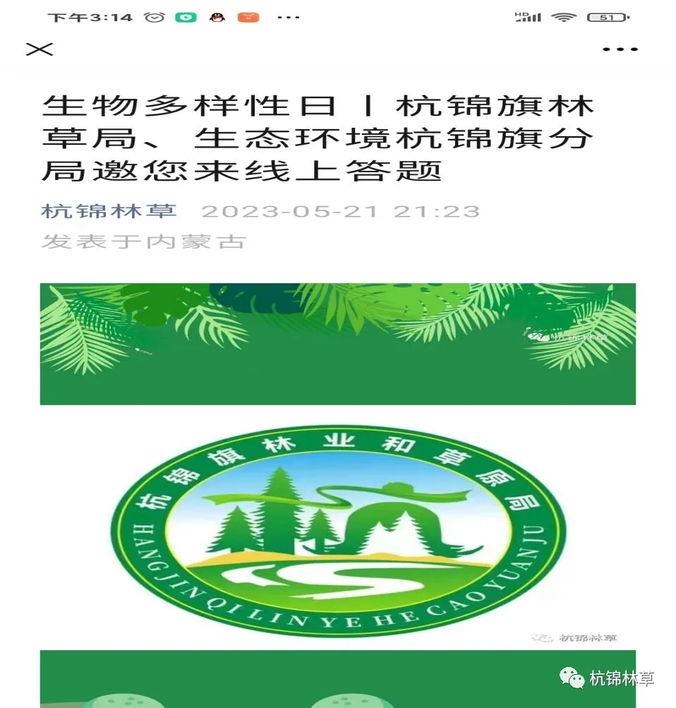 5月22日国际生物多样性日之际,杭锦旗林业和草原局以“从协议到协力:复元生物多样性”为主题开展系列宣传活动,展示杭锦旗生物多样性保护成果,向14万杭锦儿女发出绿色动员、绿色呼唤。
